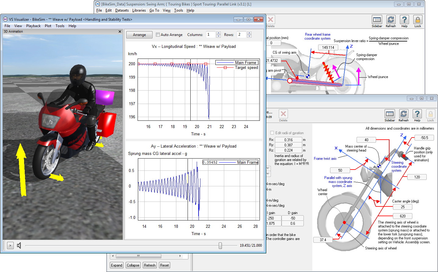 BikeSim includes a GUI for database, VS Solvers for motorcylcle/scoot math models, and VS Visualizer. This example shows the weave instability. Click for more detail.