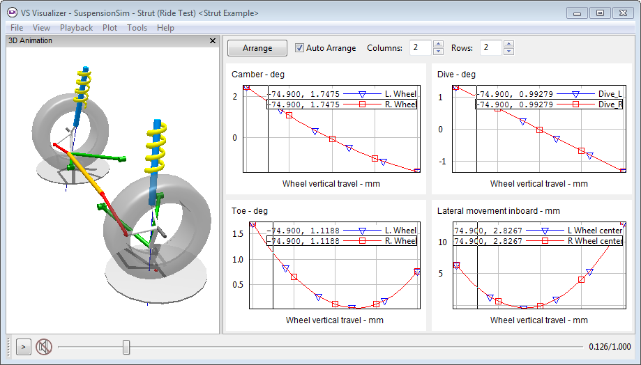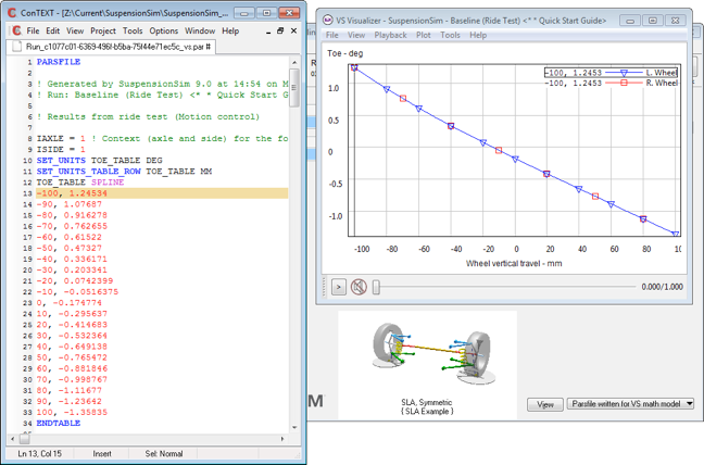 SuspensionSim can generate custom outputs based on user specifications. Generate suspension kinematics and compliance properties in Parsfiles, for direct use in CarSim, TruckSim, and BikeSim. For example, with a set of simulated K&C test procedures, one button click is all you need to generate a Parsfile for suspension/steering information usable in a VehicleSim vehicle model.
